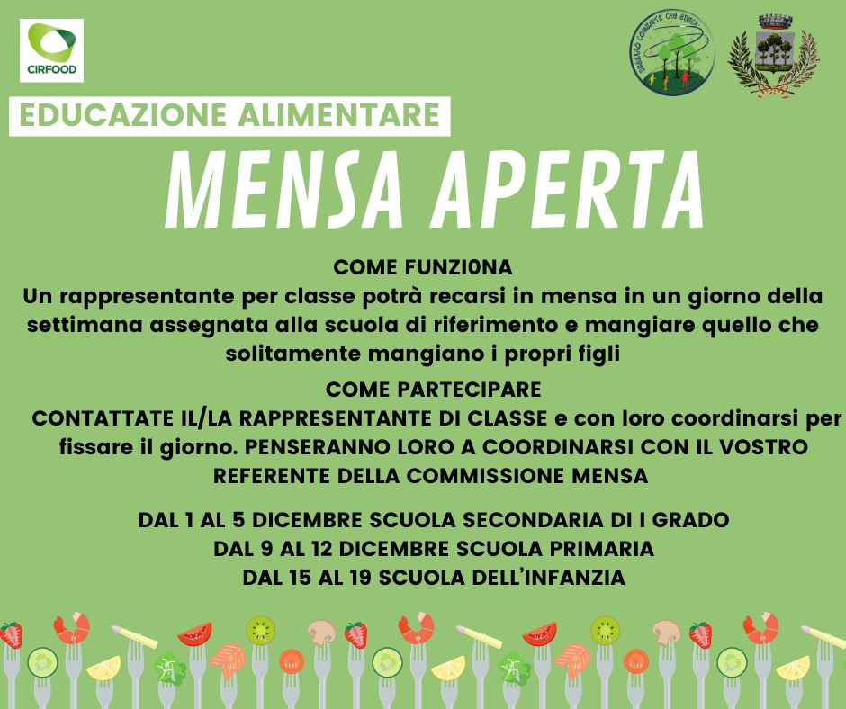 Si informano i genitori degli studenti che usufruiscono del servizio di refezione scolastica che dal 1° al 19 dicembre sarà possibile partecipare all’iniziativa “Mensa Aperta”, durante la quale avrete l’opportunità di degustare il pasto servito presso la mensa scolastica, secondo le modalità indicate nel volantino allegato.